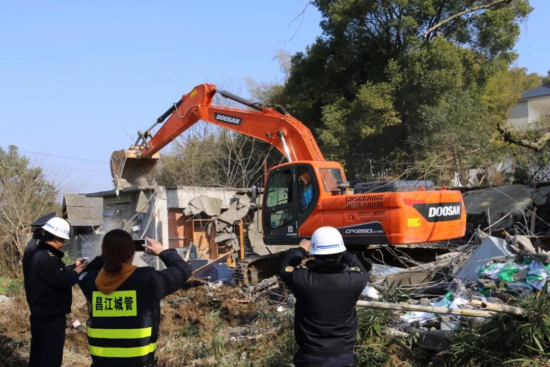 现场,各部门按时间节点进入各自分工区域,设立警戒线,清理、劝离不相关人员,街道提前介入进行宣传教育劝导工作,确保拆违的安全有序。拆除行动持续了9个多小时,过程平稳顺利,最终拆除违建15处,拆除面积10300平方米。另抽调执法人员拆除新枫街道三河村2处违建,拆除面积240平方米。