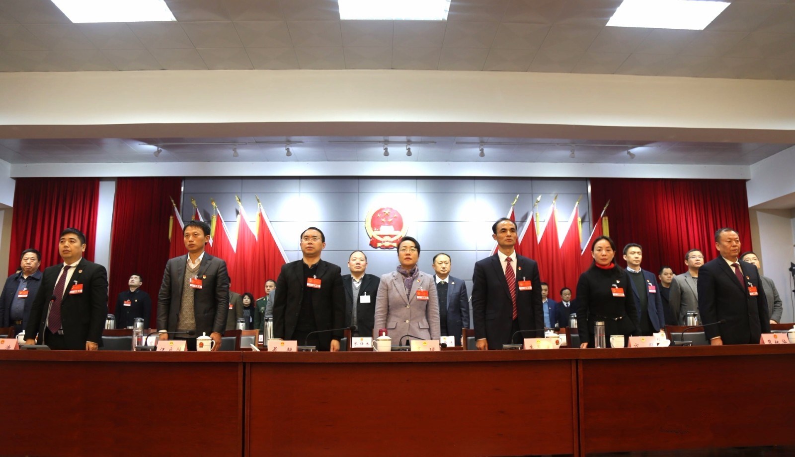 会上,当选人员左手抚按《中华人民共和国宪法》,右手举拳,庄严宣誓:“我宣誓:忠于中华人民共和国宪法,维护宪法权威,履行法定职责,忠于祖国、忠于人民,恪尽职守、廉洁奉公,接受人民监督,为建设富强、民主、文明、和谐的社会主义国家努力奋斗!”