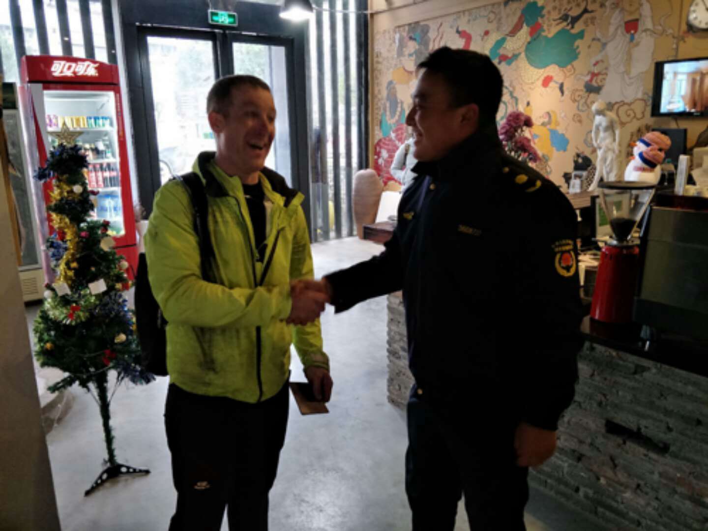 经过一番的交流后,队员们这才知道他是英国人,到景德镇旅行,下一站的旅行地点是婺源,因手机里的导航有误,始终找不到要入住的旅舍,在附近已经绕了很久了。在得知他要去的是景德镇国际青年旅舍,距离较远,为防止其再次迷路,决定派2名队员开车护送他去旅舍,其余队员继续巡查工作。途中,队员看他骑行有些乏力,还特意买了瓶矿泉水给他,没想他“咕噜咕噜”一口气全喝完了,“Thank you”!队员的友善令外国友人十分感动,半小时后,抵达了入住旅舍,临别时,外国友人一再向城管队员表示感谢。